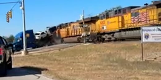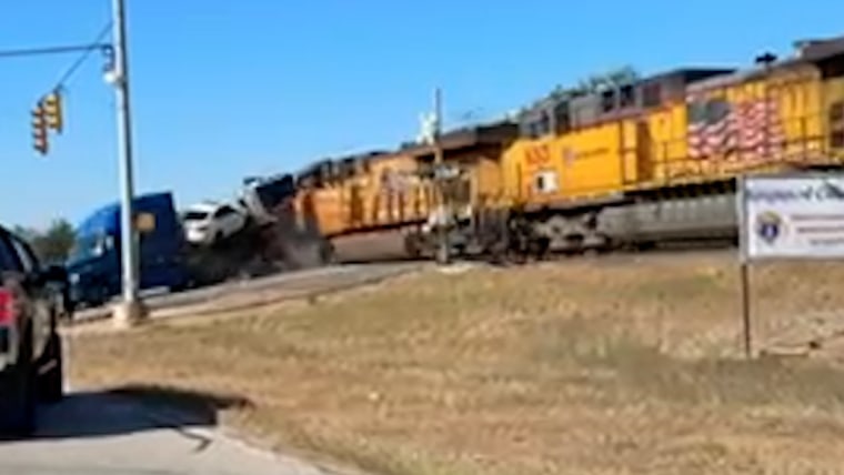 Train collides with truck hauling cars in Texas